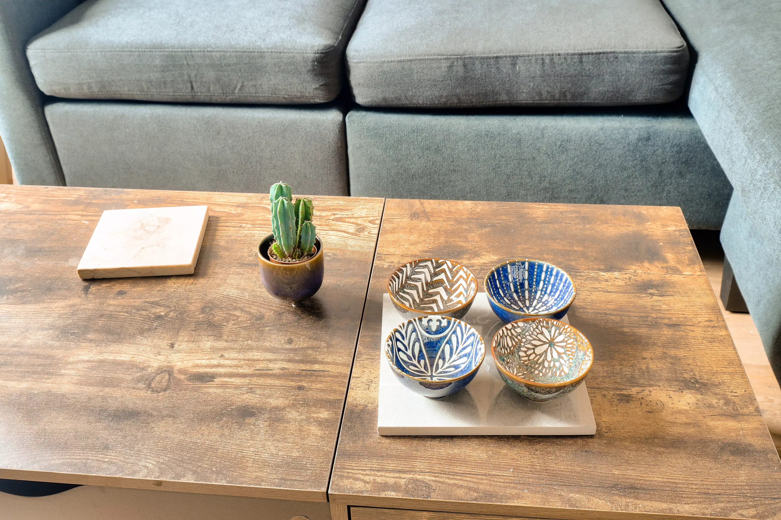 Dining area: 1 table with 4 stools. 4 seats at the table in the living room