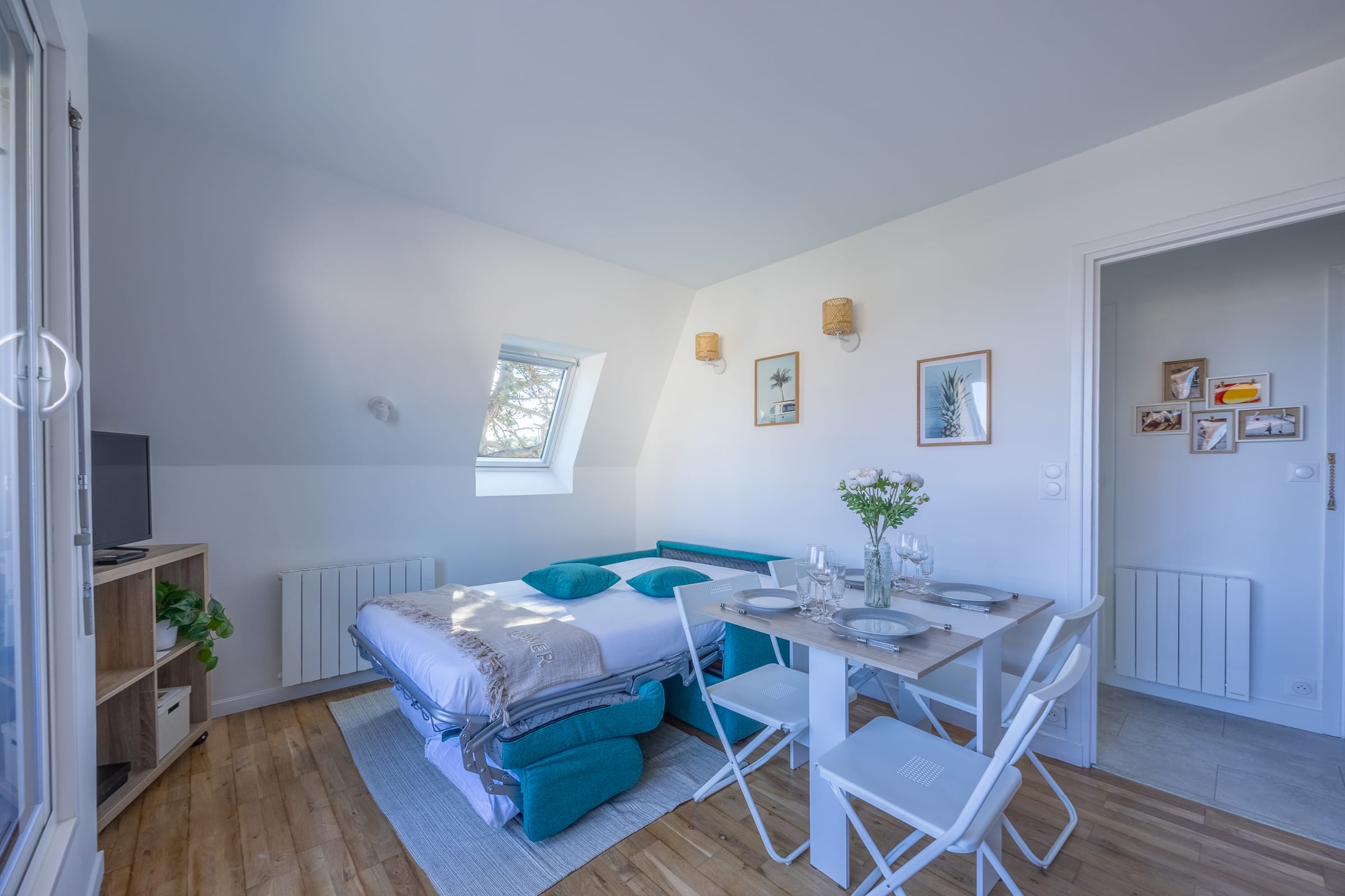 The apartment is just a few steps from the sea, in the center of Cabourg, in the fan zone. The property is ideally located for doing everything on foot. You'll love the direct proximity to the beach, gourmet restaurants, chic boutiques and entertainment venues such as mini-golf, the cinema, the casino and the carousel.
