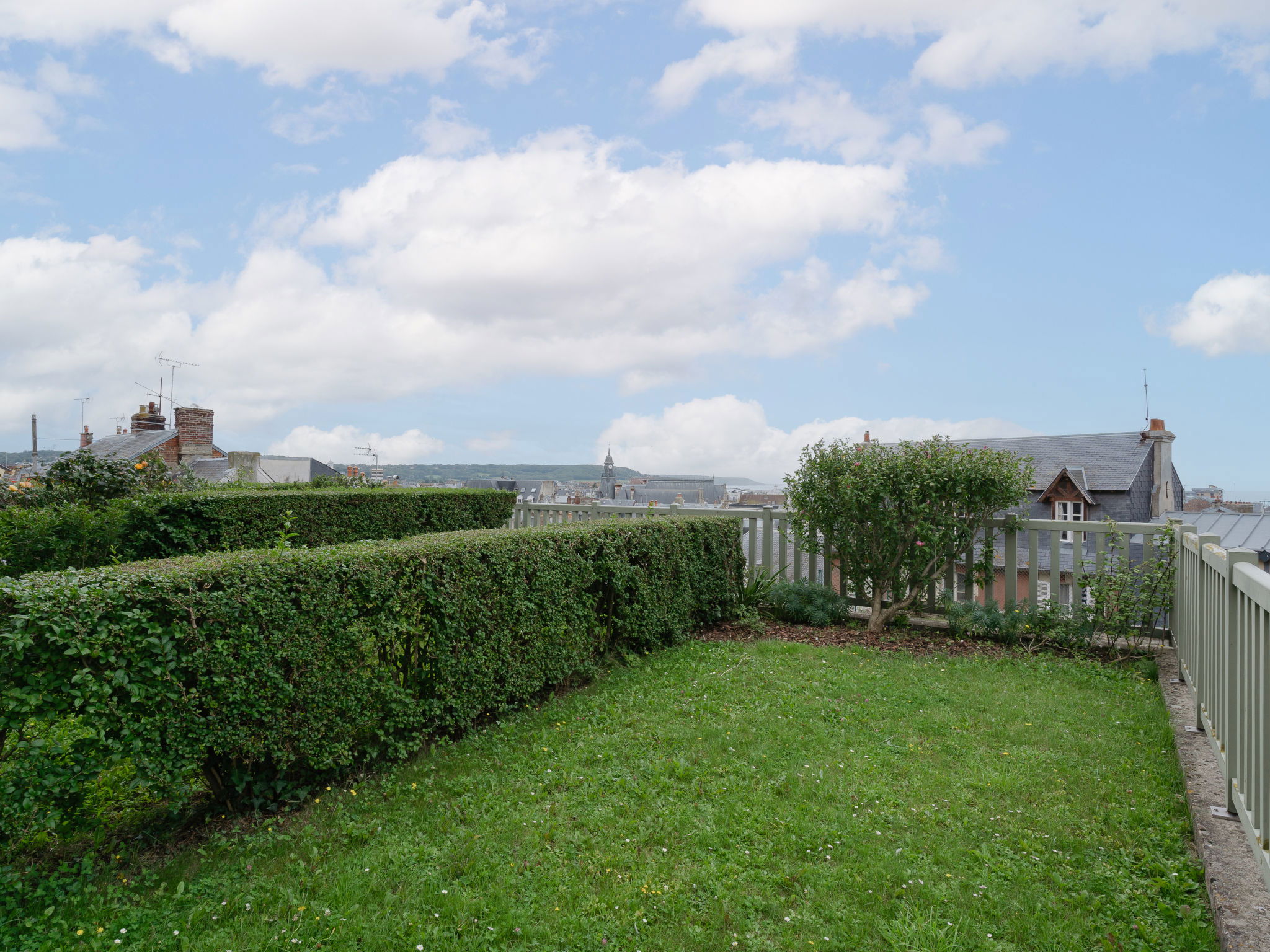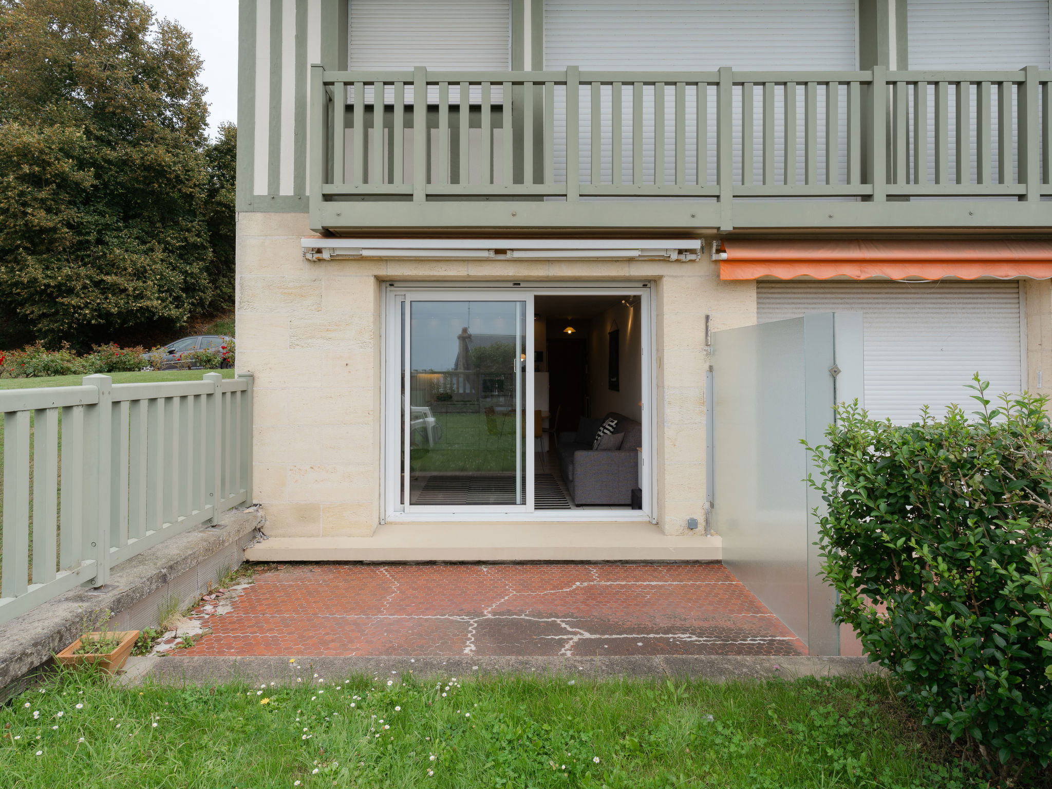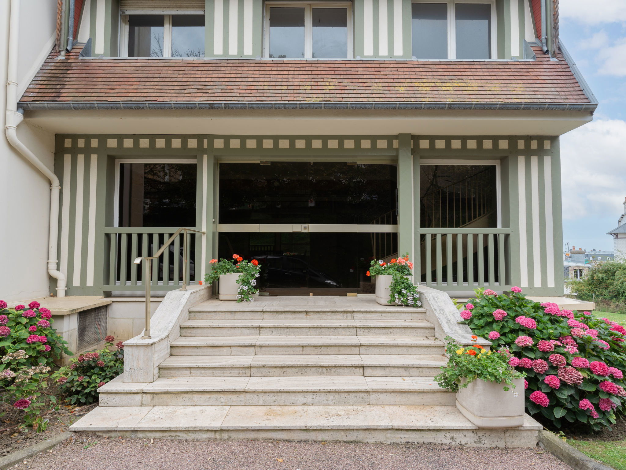 Trouville-sur-mer: Apartment house "Le Drakkar", 4 storeys. In a central position, 600 m from the sea, 600 m from the beach, located by a road, west facing position. For shared use: natural garden (fenced). Private: patio (30 m2), terrace, garden furniture. In the house: lift. Grocery, supermarket 650 m, restaurant, bar 200 m, railway station "Deauville-Trouville" 1.1 km, thermal baths "Cures marines" 1 km. Golf course 4.8 km. The keys‘ handover takes place by the agency in Deauville.