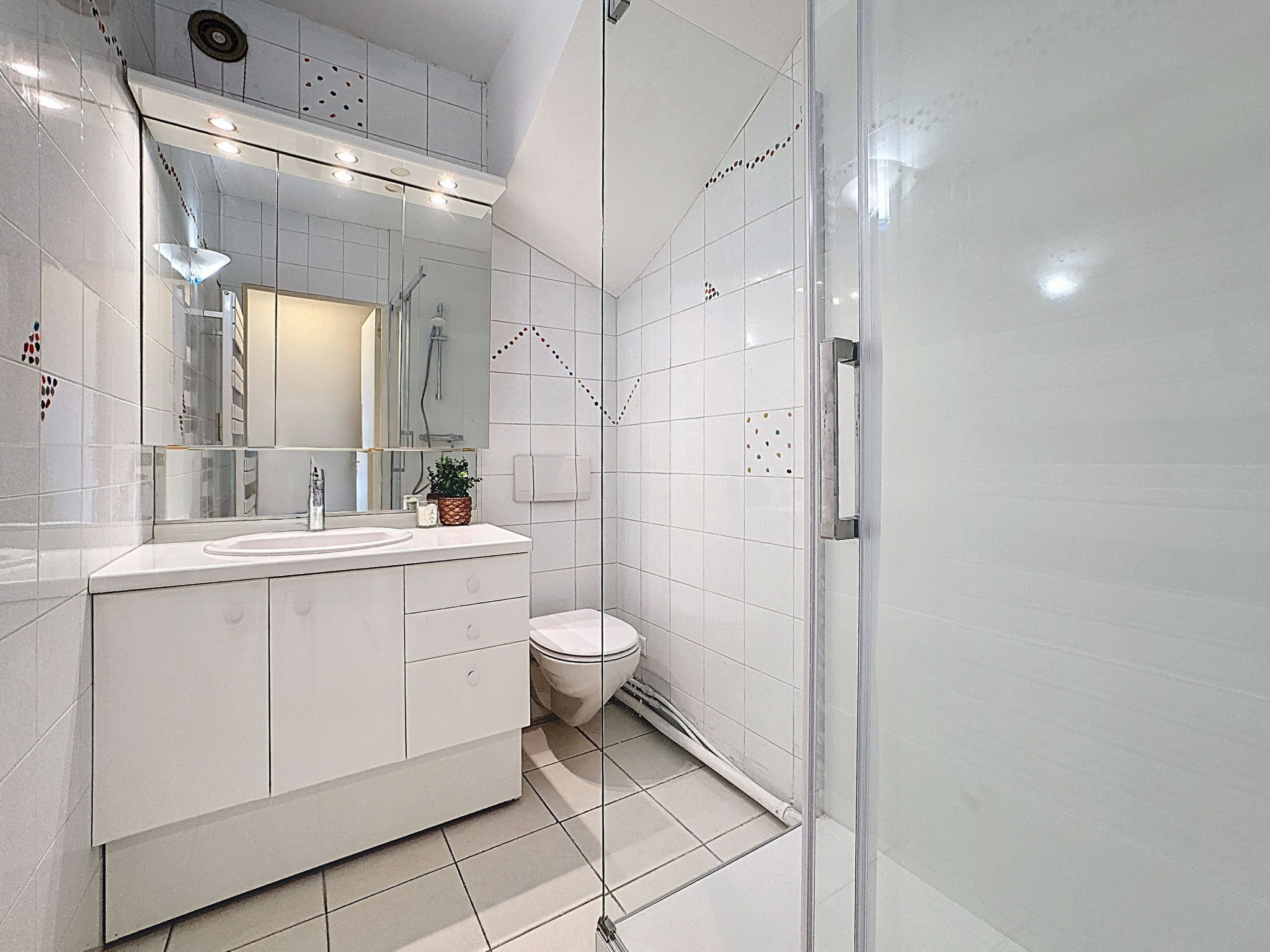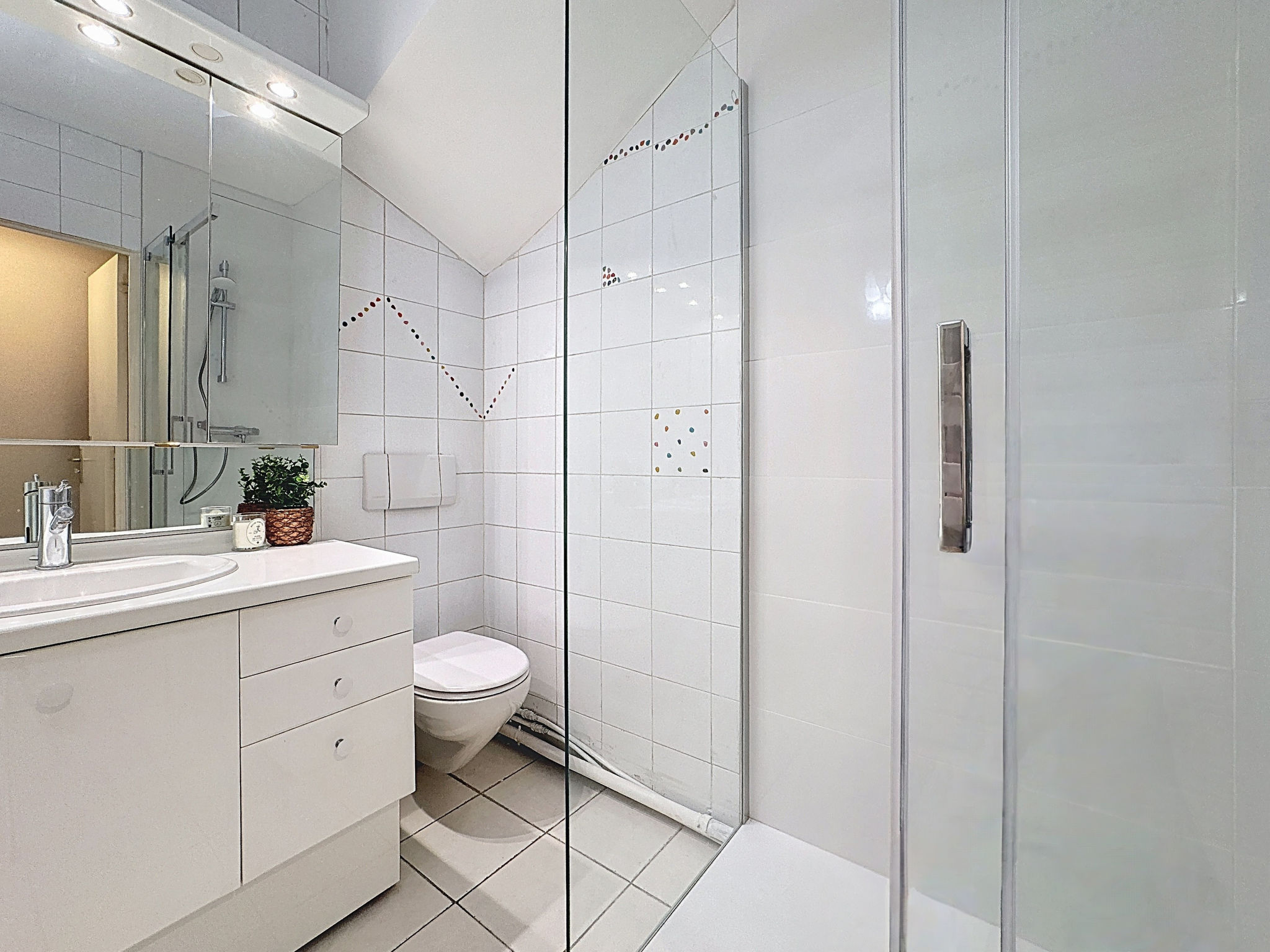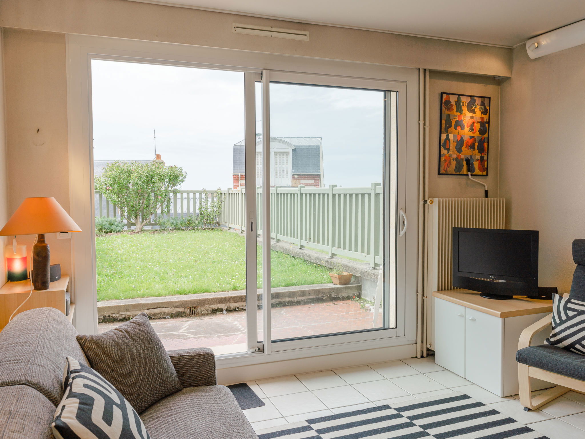 Trouville-sur-mer: Apartment house "Le Drakkar", 4 storeys. In a central position, 600 m from the sea, 600 m from the beach, located by a road, west facing position. For shared use: natural garden (fenced). Private: patio (30 m2), terrace, garden furniture. In the house: lift. Grocery, supermarket 650 m, restaurant, bar 200 m, railway station "Deauville-Trouville" 1.1 km, thermal baths "Cures marines" 1 km. Golf course 4.8 km. The keys‘ handover takes place by the agency in Deauville.