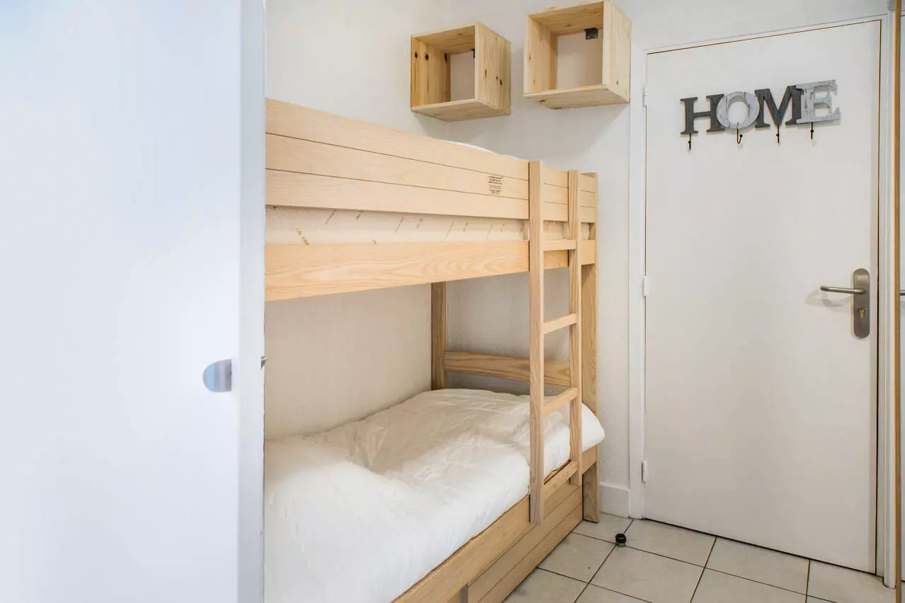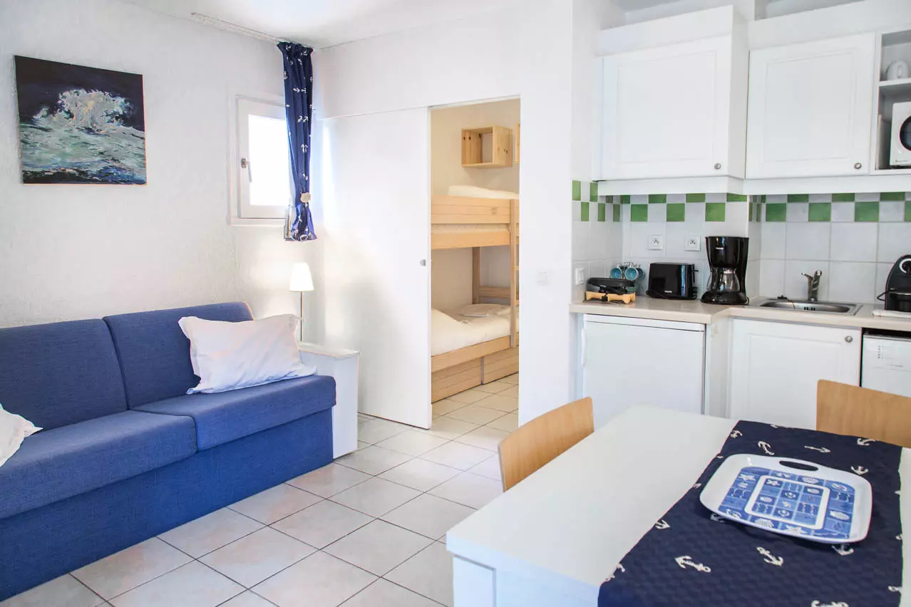 Living room facilities: 1 sofa bed (sleeps 2) and 1 cabin area with 1 bunk bed. Dining area: a table with 4 chairs.