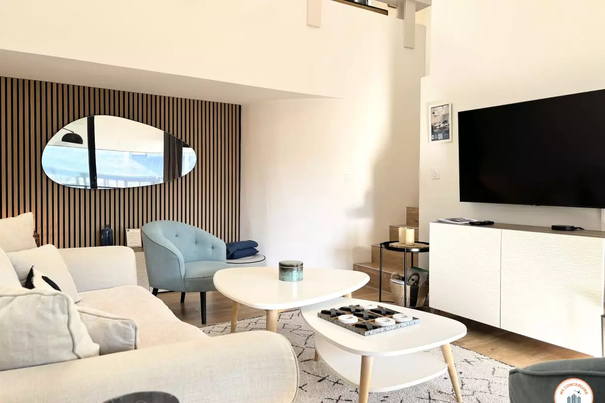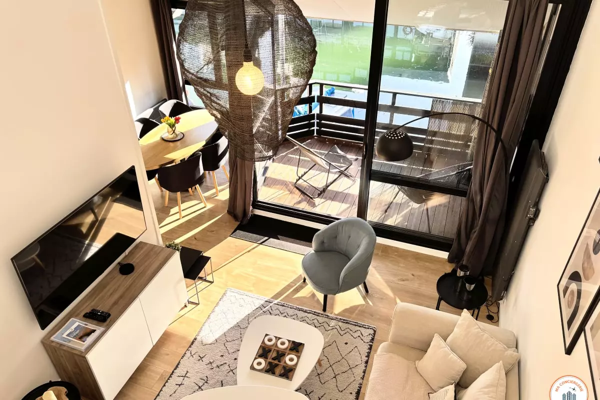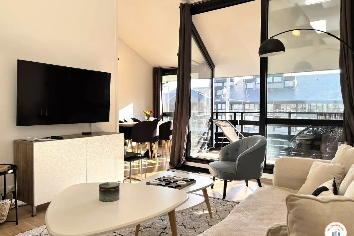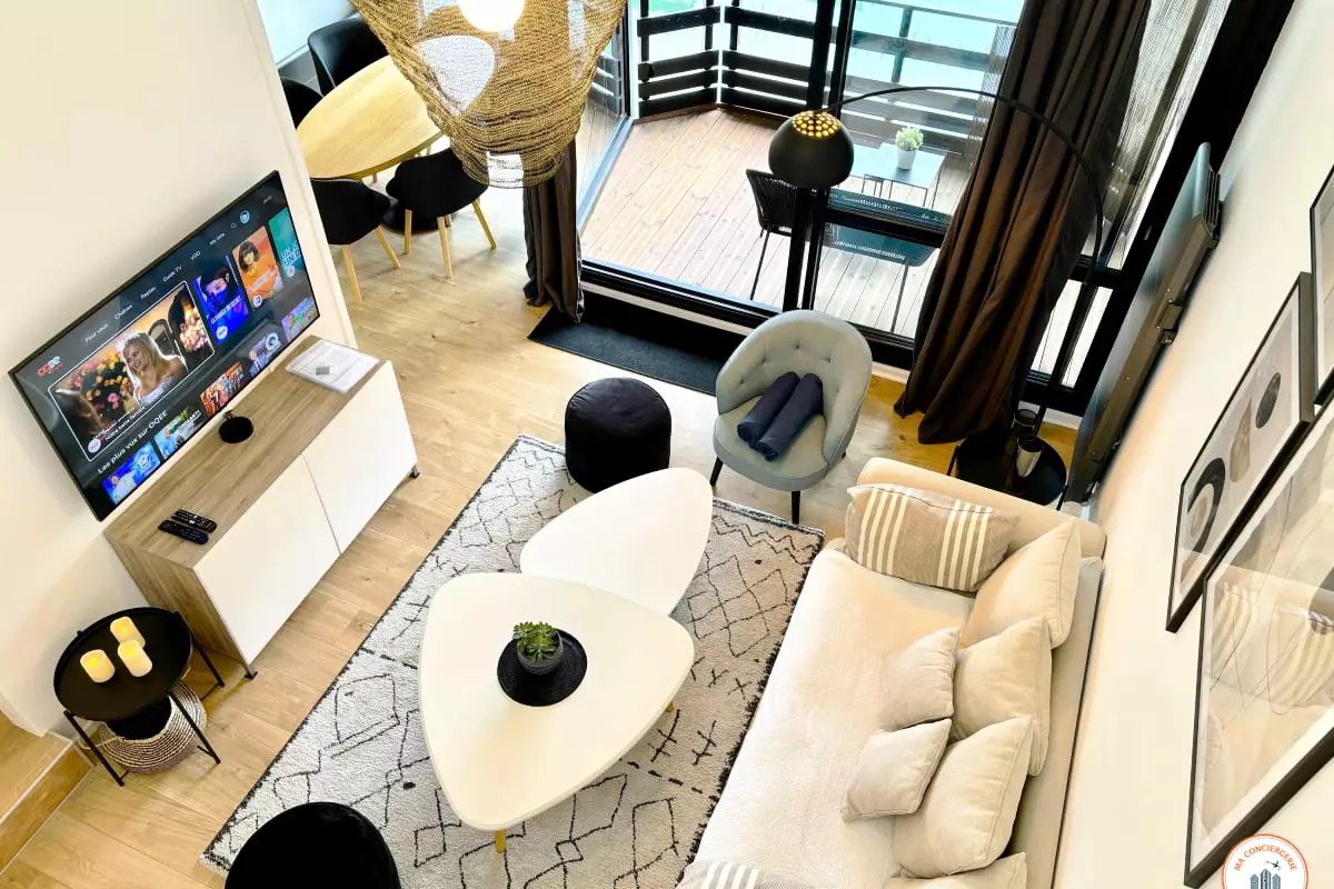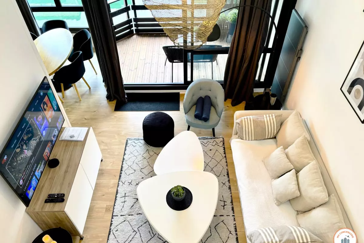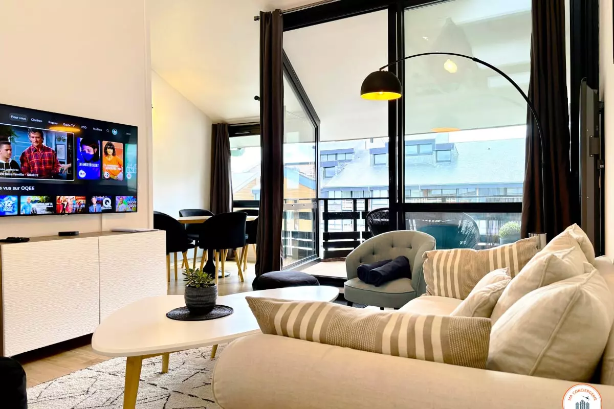 A beautiful living room equipped with a Smart TV, opening onto a beautiful terrace with garden furniture. The terrace offers a magnificent view of the marina and the casino;