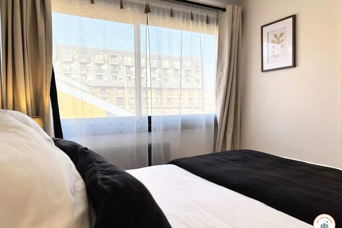 - A bedroom with a Queen Size bed (160 x 200 cm) overlooking the interior courtyard of the Marina;