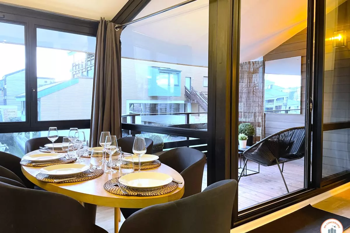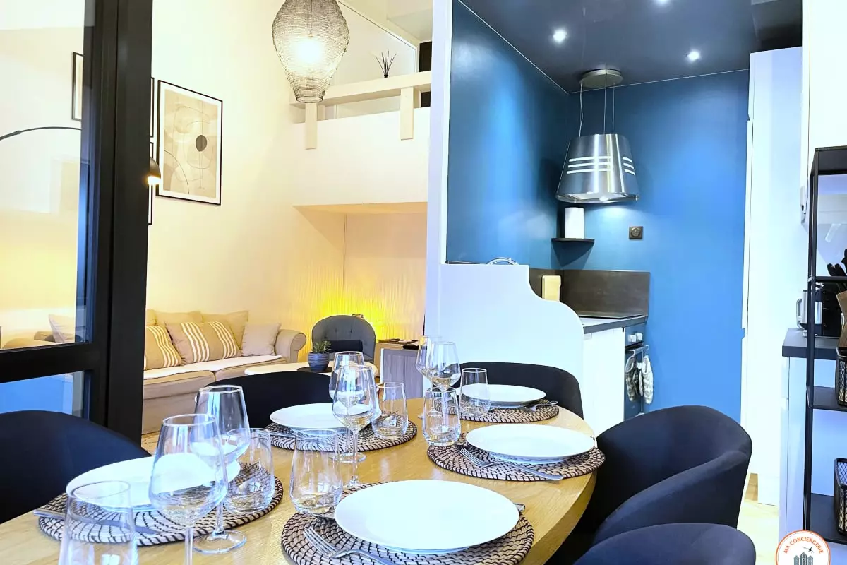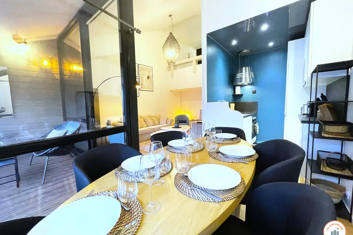 A fully equipped kitchen (oven, microwave, dishwasher, coffee maker, kettle, etc.) opening onto a dining area that can accommodate 4 guests.