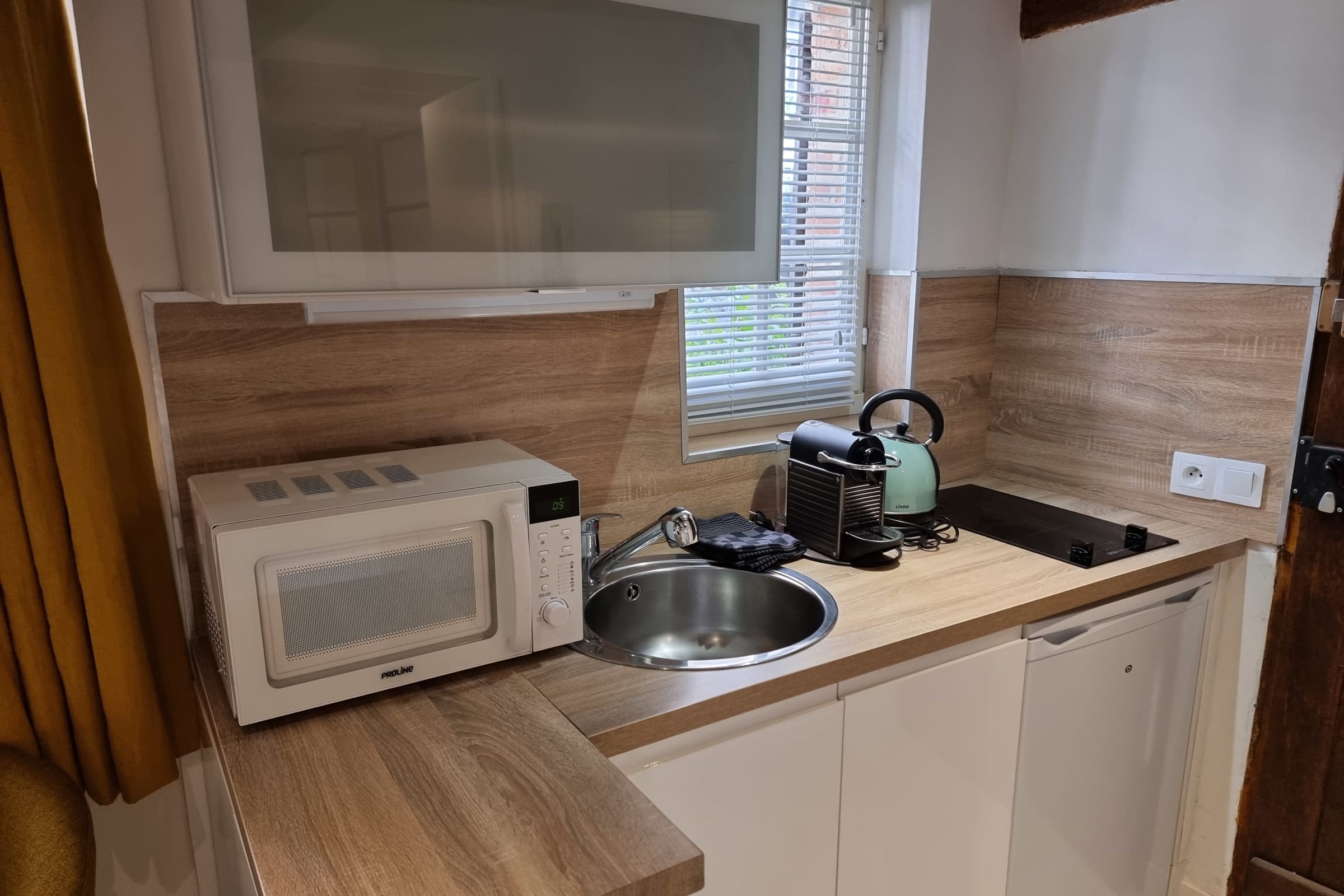 In this pretty setting is located, 1 double bed 160 cm, a dining area with TV and fireplace as well as a small kitchen (Nespresso coffee machine, kettle, toaster, hob, fridge, microwave). 1 modern bathroom with bath and wc.