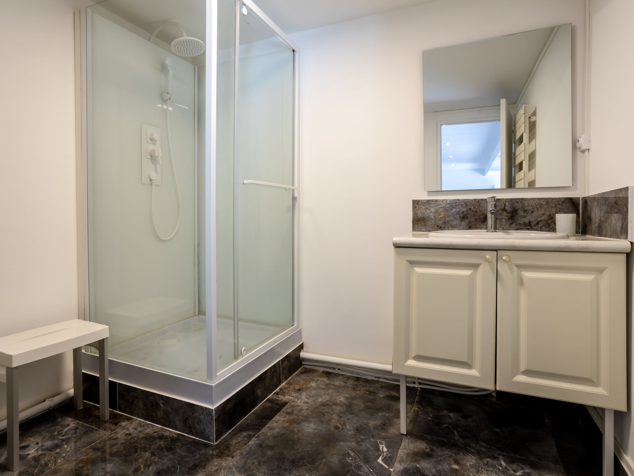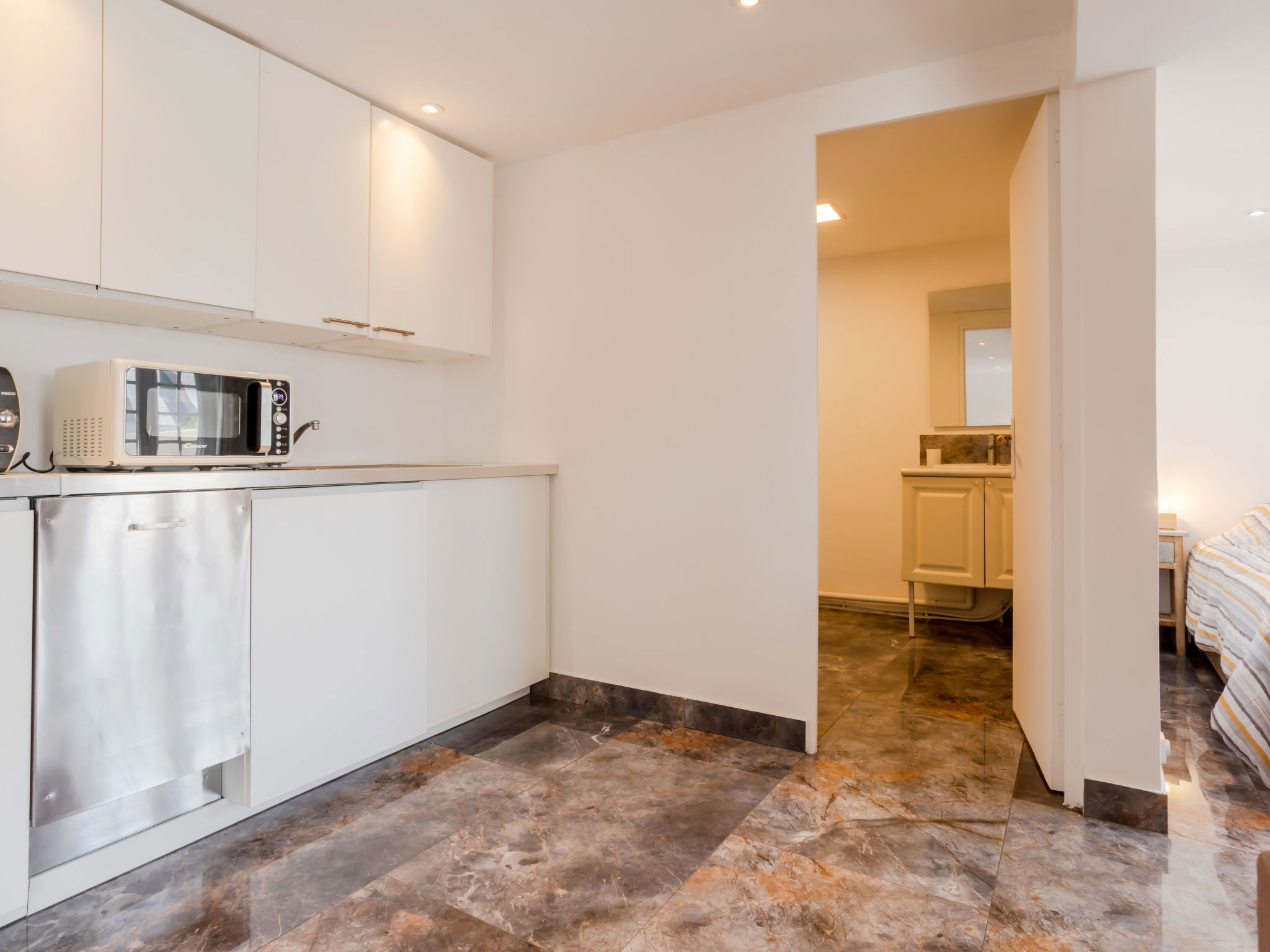 1-room studio 37 m2, south-west facing position. Renovated in 2024: living/dining room with 1 double sofabed (140 cm, length 190 cm), TV (flat screen). Exit to the terrace. Alcove with 1 french bed (140 cm, length 190 cm). Kitchenette (oven, dishwasher, 4 ceramic glass hob hotplates, toaster, kettle, microwave, freezer, electric coffee machine, Capsules for coffee machine (TASSIMO) extra). Bath/WC. Electric heating. Large terrace 30 m2, south facing position and west facing position. Terrace furniture. Facilities: Internet (WiFi, free). Please note: smoke alarm. Offer by a private individual according to Art. 155, IV of CGI.