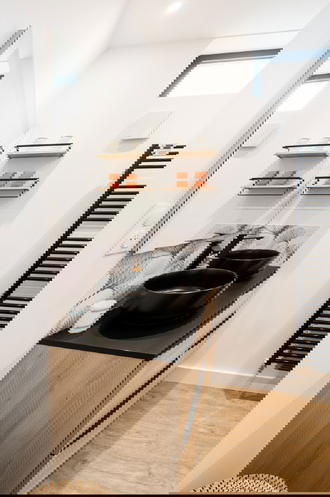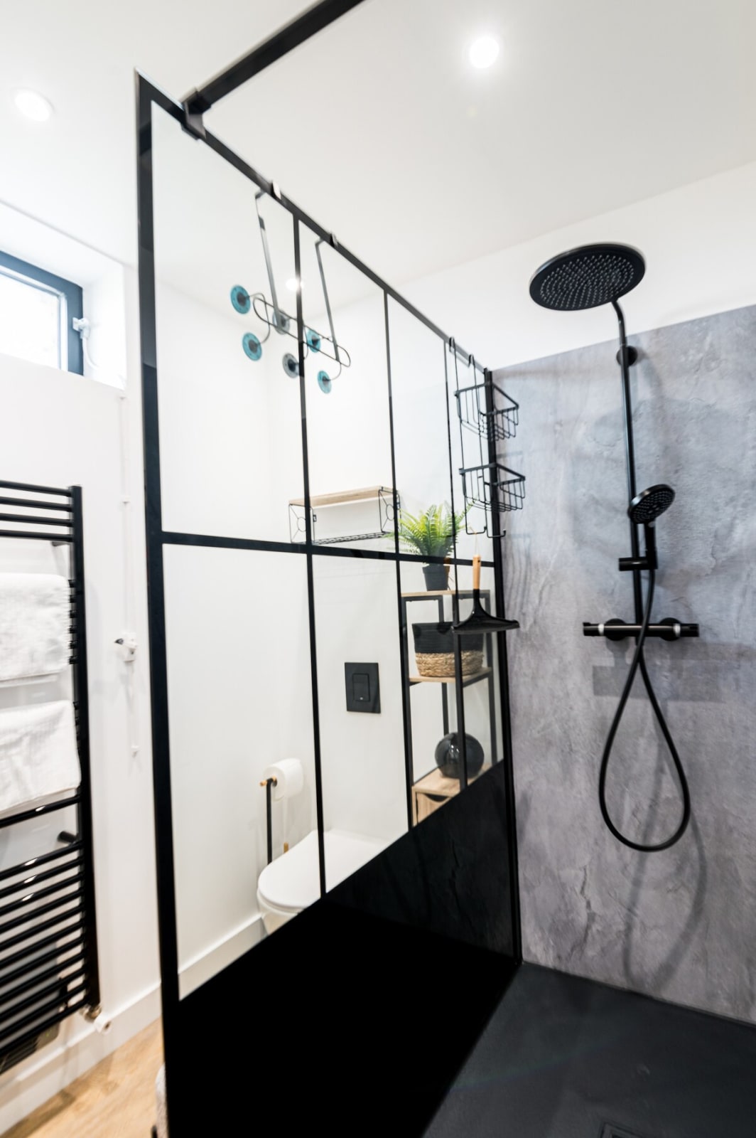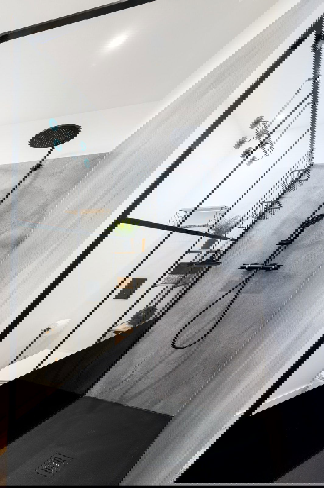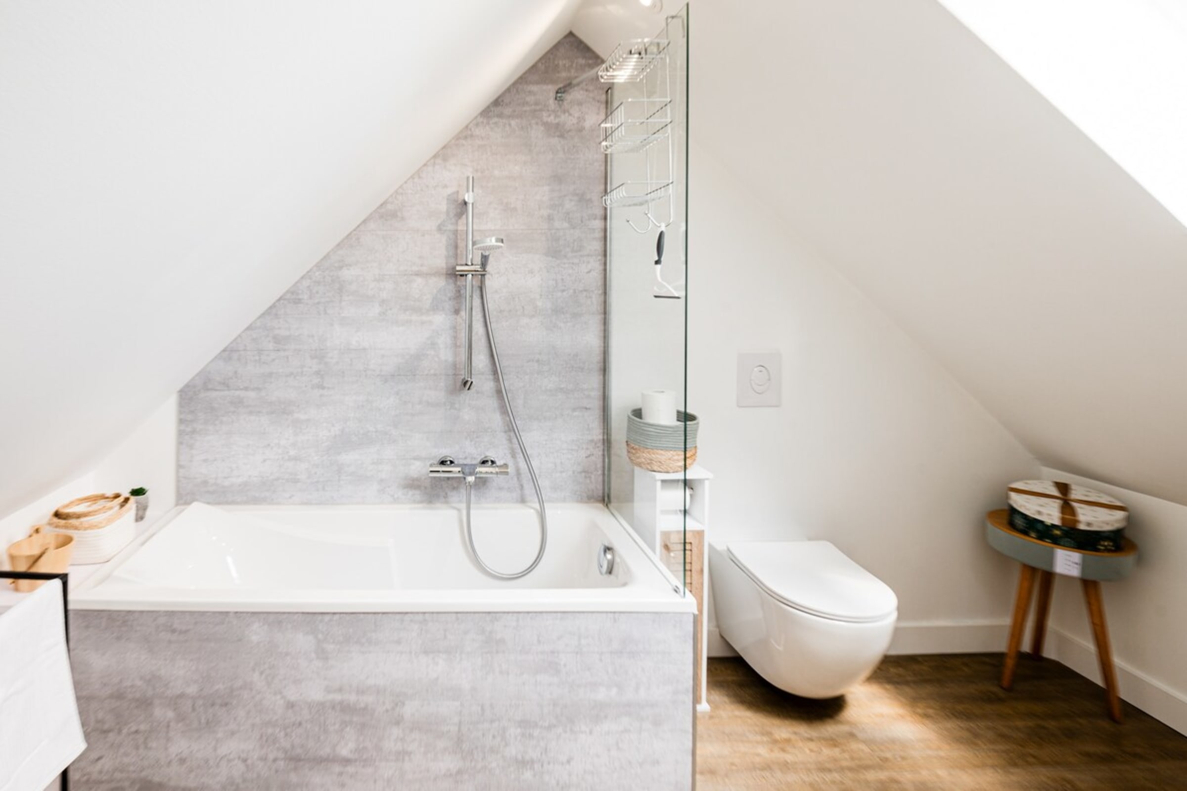 Two Modern bathrooms with their own unique atmospheres: one features a walk-in shower, the other a bathtub for relaxing moments.