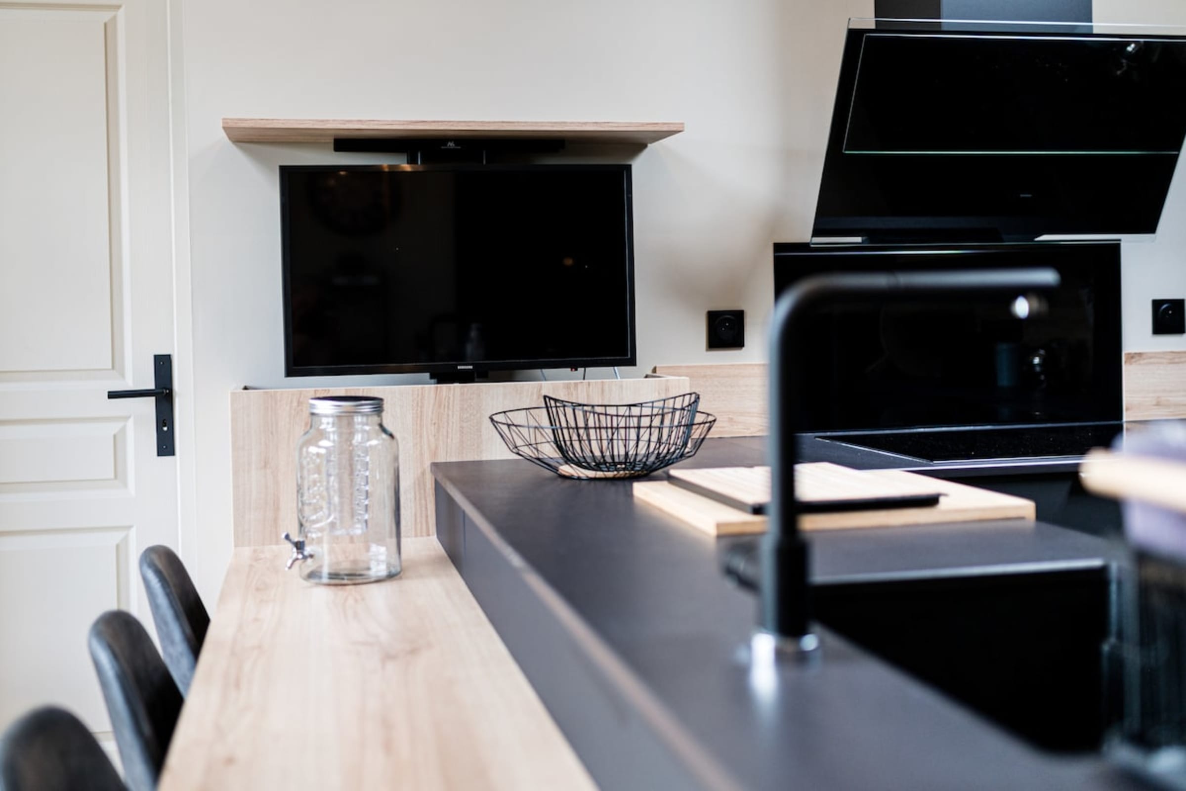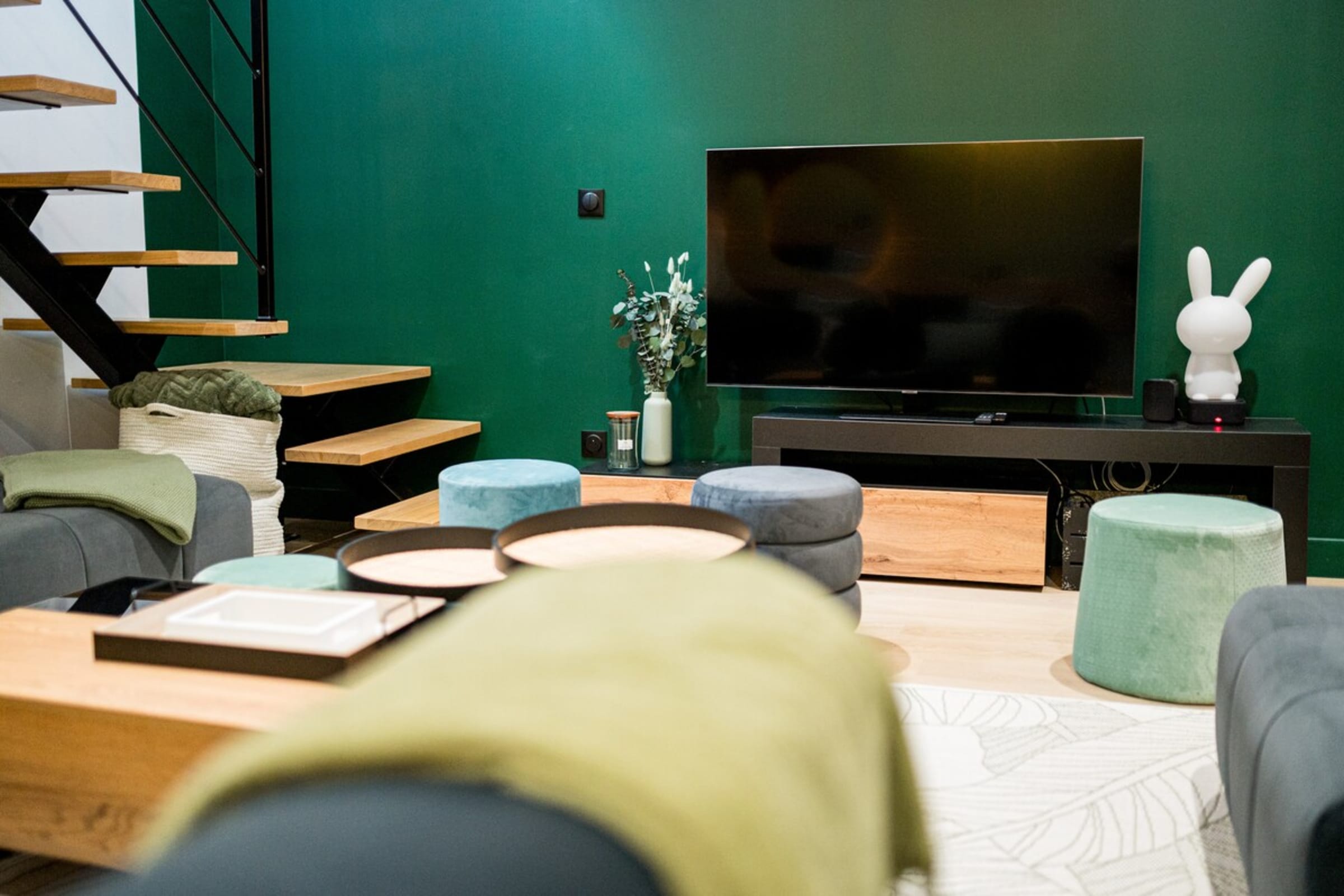 Warm double living room with comfortable sofas, Smart TV, and high-speed Wi-Fi