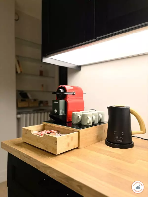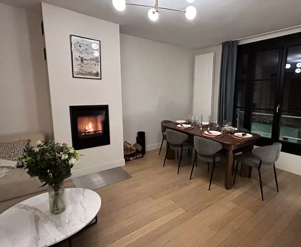 - A fully equipped kitchen (stove, oven, American fridge, Nespresso coffee machine, dishwasher and all the equipment necessary to cook delicious meals with family or friends) semi-open to a living/dining room area equipped with a smart TV (Netflix included), a table that can seat 8 people and a small fireplace to spend beautiful winter nights by the fire.